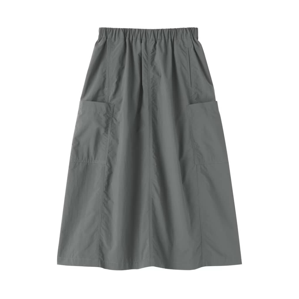 「婦人 撥水 カーゴスカート」(4990円)は、機能性とデザイン性を兼ね備えた、日常使いしやすいカジュアルスカートです。水を弾きやすい撥水加工を施した素材を使用しており、小雨や汚れが気になる場面でも気軽に着用可能。日常からアウトドアまで幅広く活躍します。デザイン面では、左右に配置された大きなカーゴポケットがアクセント。収納力があるだけでなく、コーディネートにほどよいカジュアル感をプラスしてくれます。また、緩やかなコクーンシルエットに仕上げたことで立体感が生まれ、体のラインを拾いにくい点もポイントです。軽やかな生地感も相まって、春夏シーズンを中心に快適に着られる一枚です。