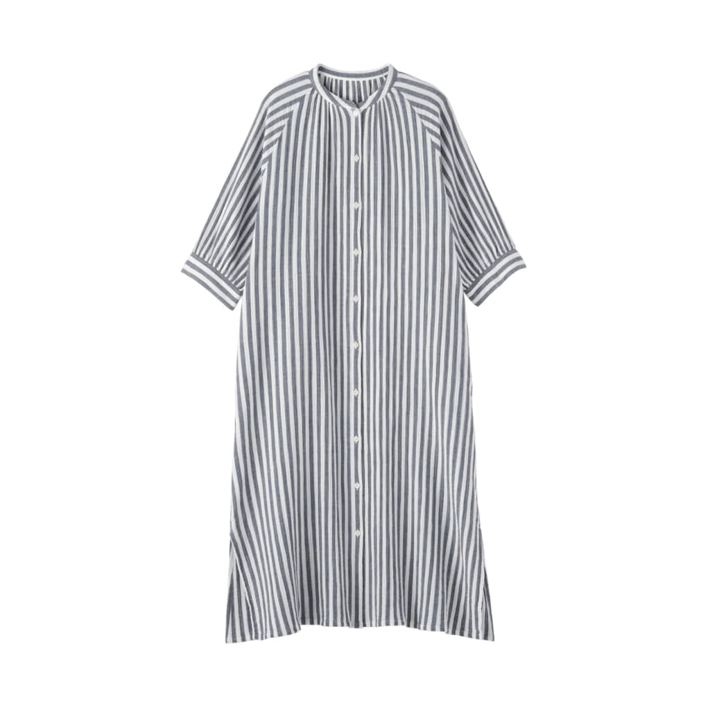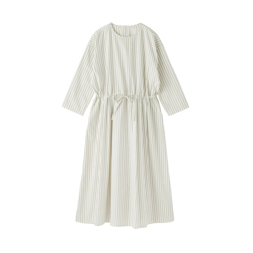 第2位は「婦人 楊柳ガーゼ 五分袖ワンピース」(税込4990円)でした。強撚糸を使ったやわらかなガーゼ素材で、肌離れがよくさらりとした着心地に仕上げた夏向きの1枚です。綿はオーガニックコットンを使用し、程よくゆとりを持たせたスタンドカラーに、前開きデザインを採用しているため、ワンピースとしてはもちろん羽織りとしても着用できる2WAY仕様になっています。