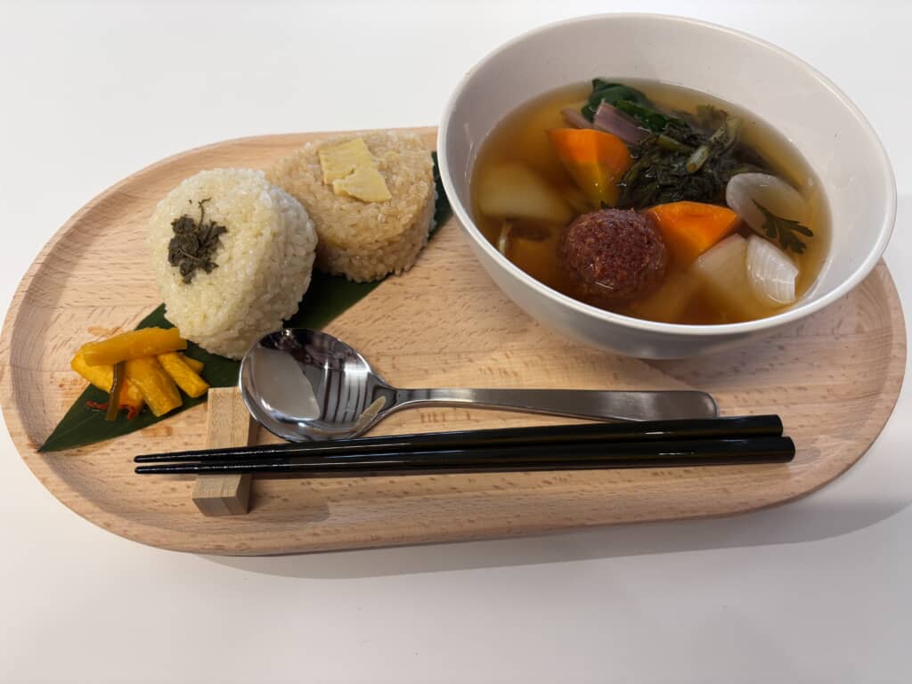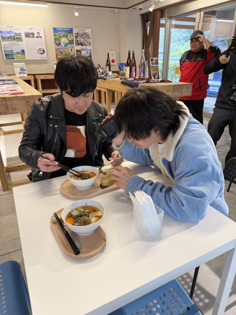 カフェコーナーも紹介しましょう。特に衝撃的だったが、おにぎりプレートに添えられるトマト味噌仕立ての汁物。朝採れ野菜がたっぷり入ったこの一杯は、味噌の深いコクとトマトの爽やかな酸味が絶妙に交わり、「今まで飲んだ汁物の中で、人生で一番美味しいかもしれない」という声が飛び出すほどの完成度です。午後からはトマトジェラートも登場し、「野菜ってこんなに美味しかったんだ」という再発見の声が続出。食べることそのものが体験になるカフェです。
