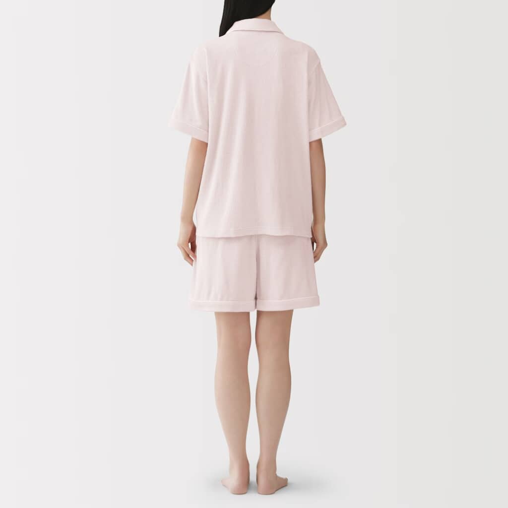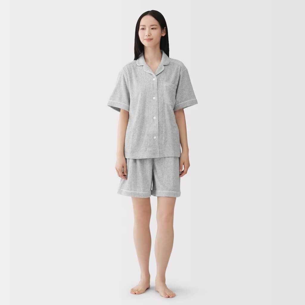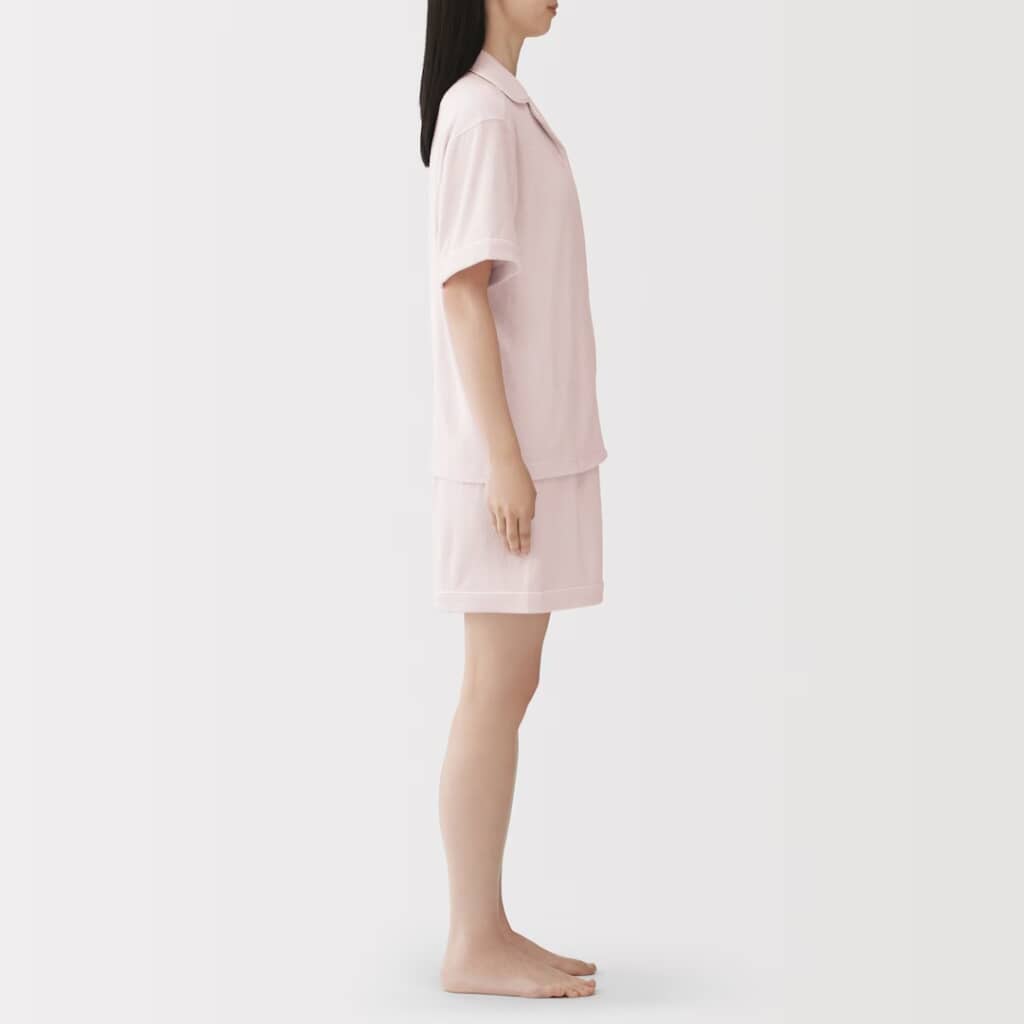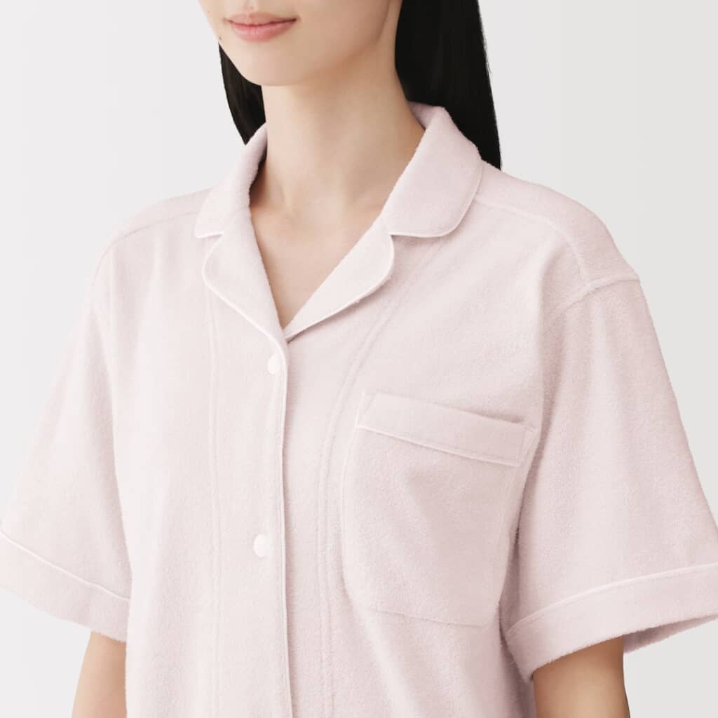 無印良品の「婦人 着るタオル 両面パイル 半袖パジャマ」は、タオルに包まれているような着心地が魅力の、両面パイル仕様の半袖パジャマ。素材にはオーガニックコットンを使用し、両面のループ部分は綿糸で仕上げることで、柔らかくやさしい肌あたりと伸縮性を実現しています。丸みのある開襟に配色パイピングを施したデザインで、脇に縫い目がなく、ボトムはやや幅広めのひざ上丈のゆったりシルエット。お風呂上がりにもぴったりの快適さです。カラーは5種類、価格は税込み4990円で販売されています。
