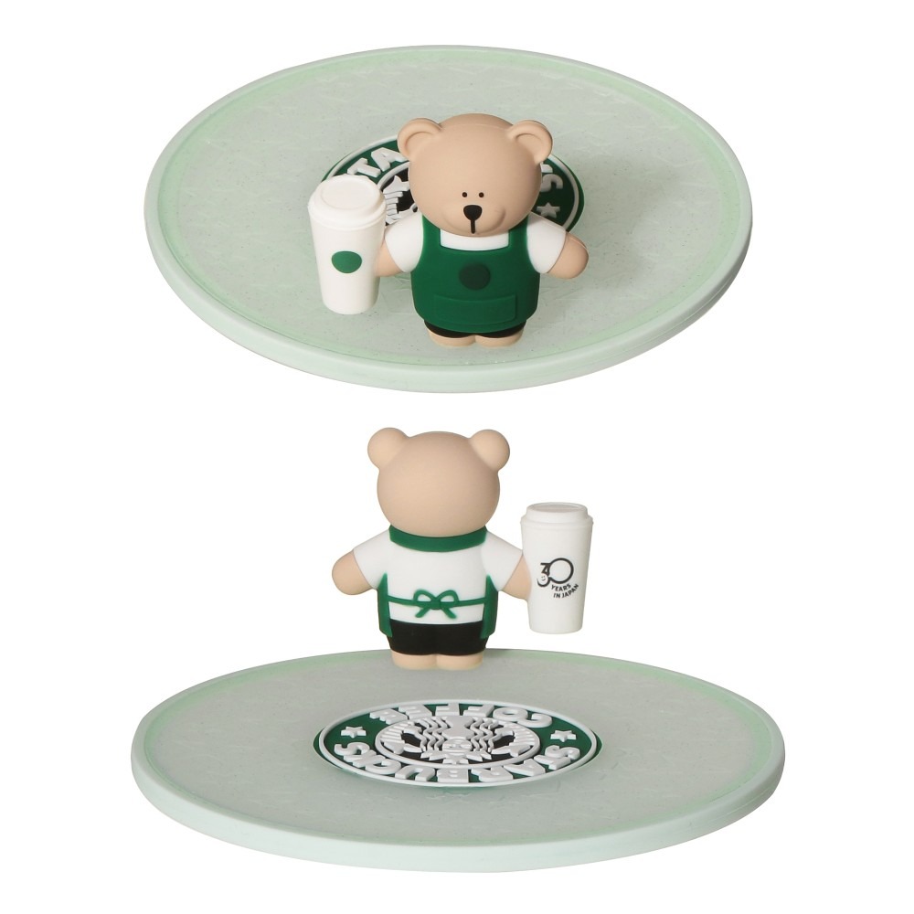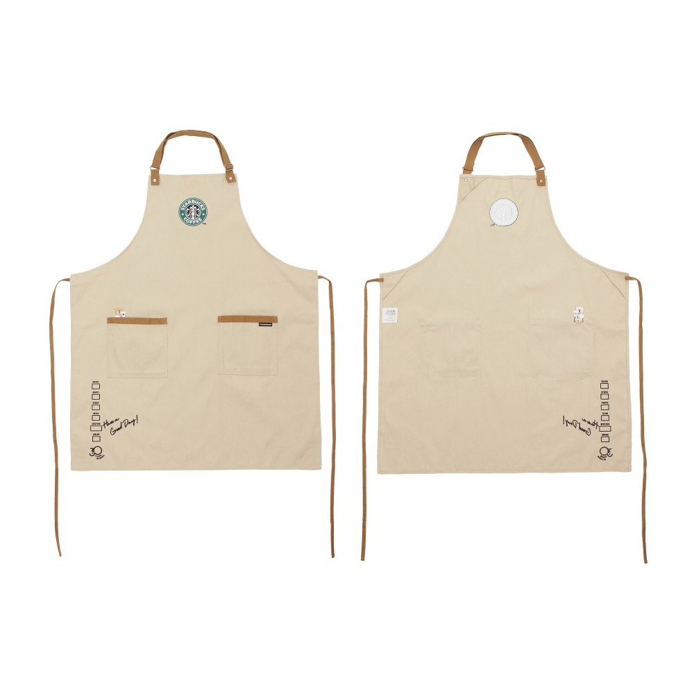 カフェエプロンはアイボリーを基調に、ブラウンの紐を合わせた落ち着いた配色。胸元には当時のロゴを配し、ポケットからベアリスタが顔をのぞかせる遊び心のあるデザインに仕上げられています。コールドカップグラスはソーダガラス製で冷たいドリンク専用。コースターはシリコーン製でベアリスタがついており、日常のコーヒータイムを癒してくれそうです。