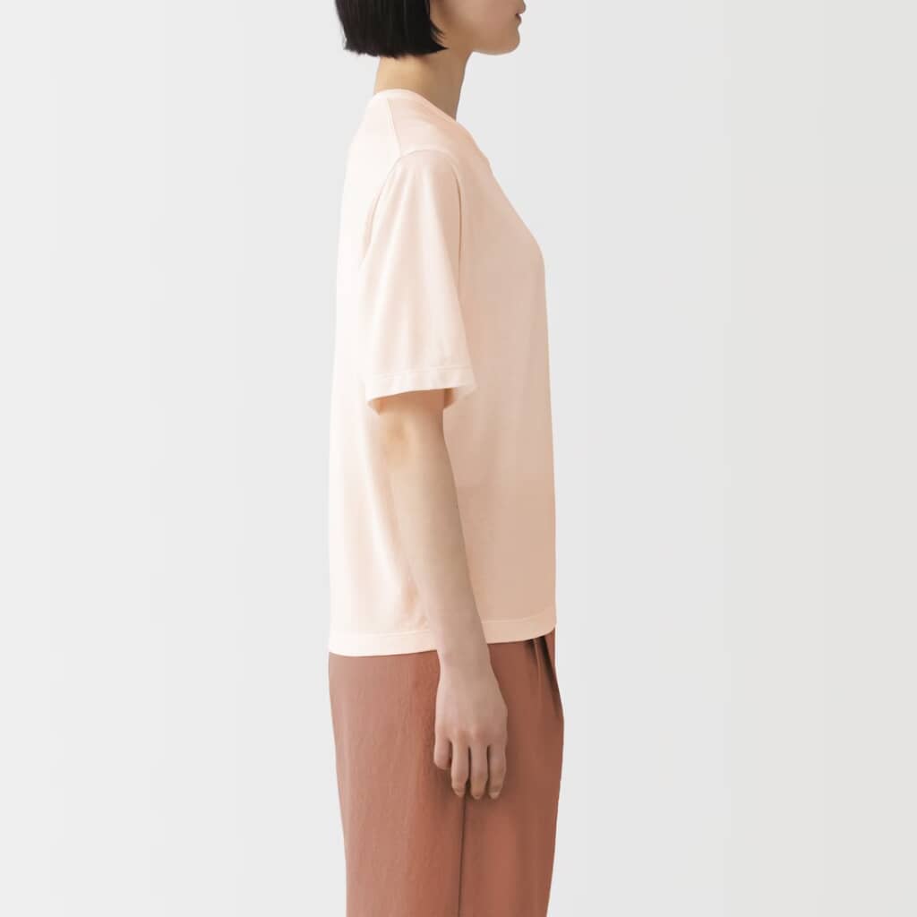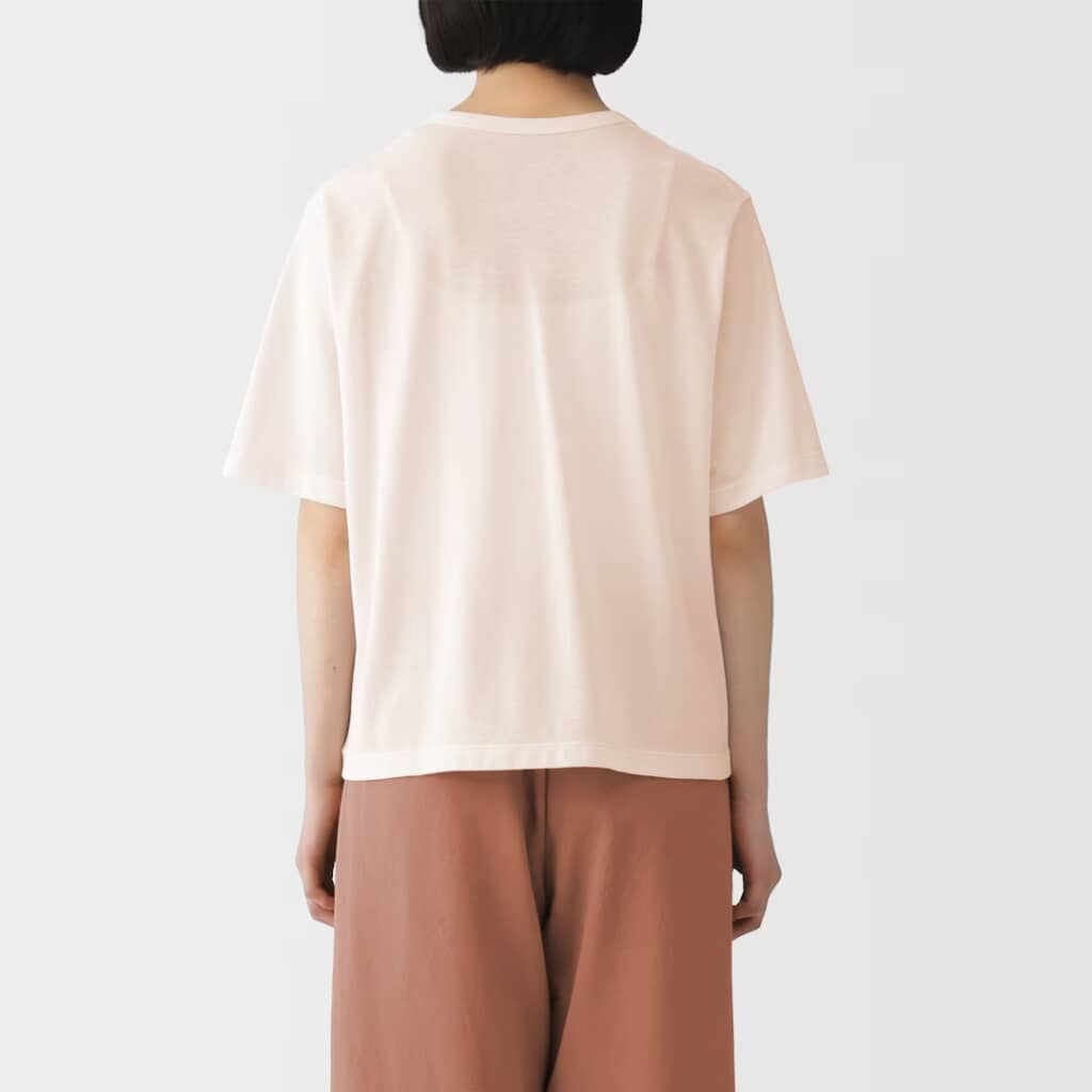 無印良品から販売されている「婦人 強撚天竺編みクルーネック半袖Tシャツ」が、ほどよいシアー感と上品なのにゆったりとしたシルエット、コットン100%の着心地の良さで高評価を集めています。