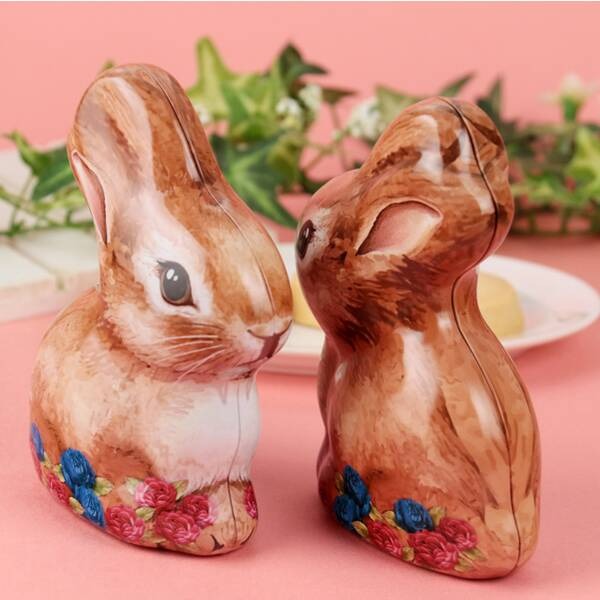 ブラウン系をベースにしたうさぎは毛並みの濃淡ややわらかな表情が印象的。足元には花の装飾が施されており、華やかさも感じられます。中のクッキーを楽しんだ後も、飾ったり小物入れとして使ったりと、長く活用しやすい点も魅力です。
