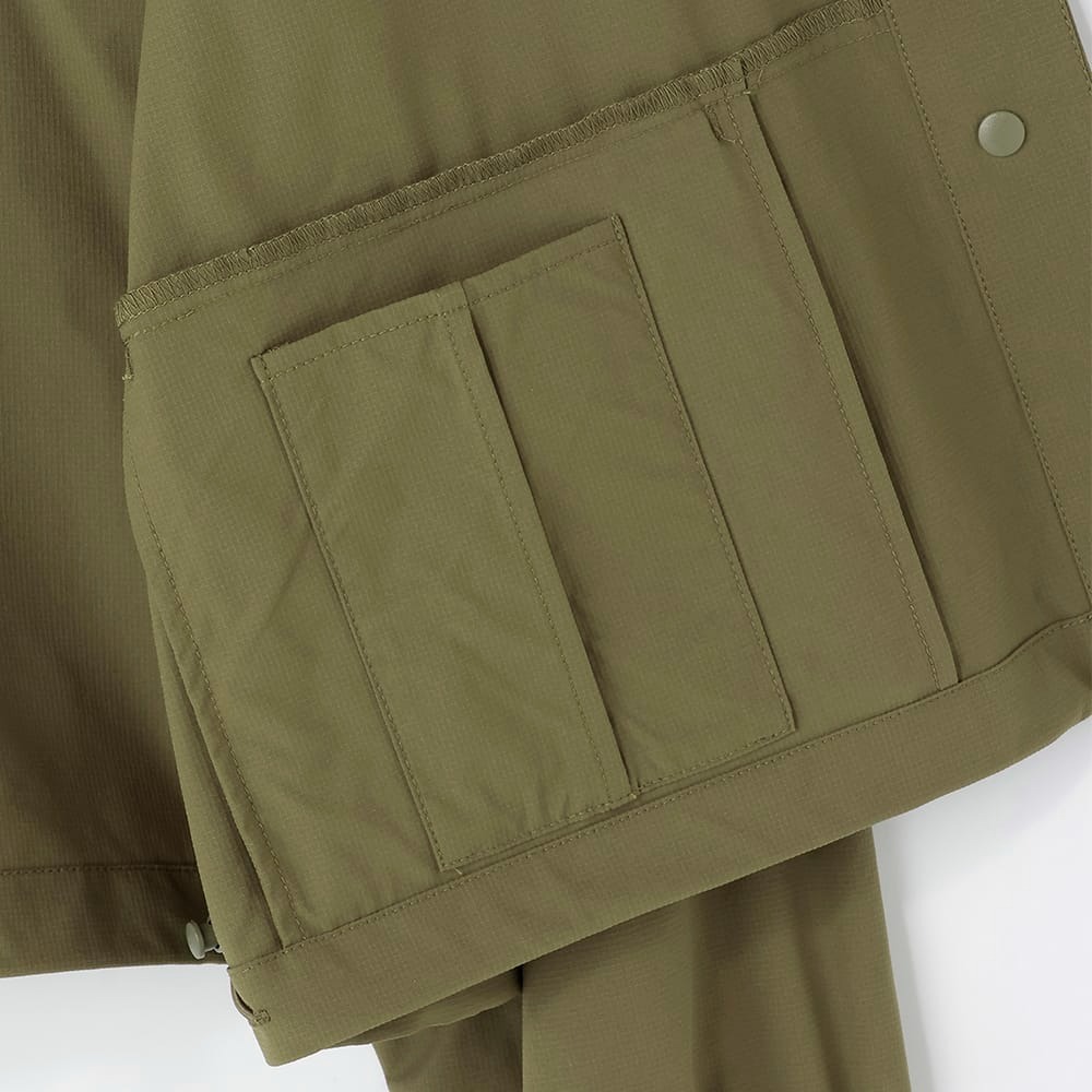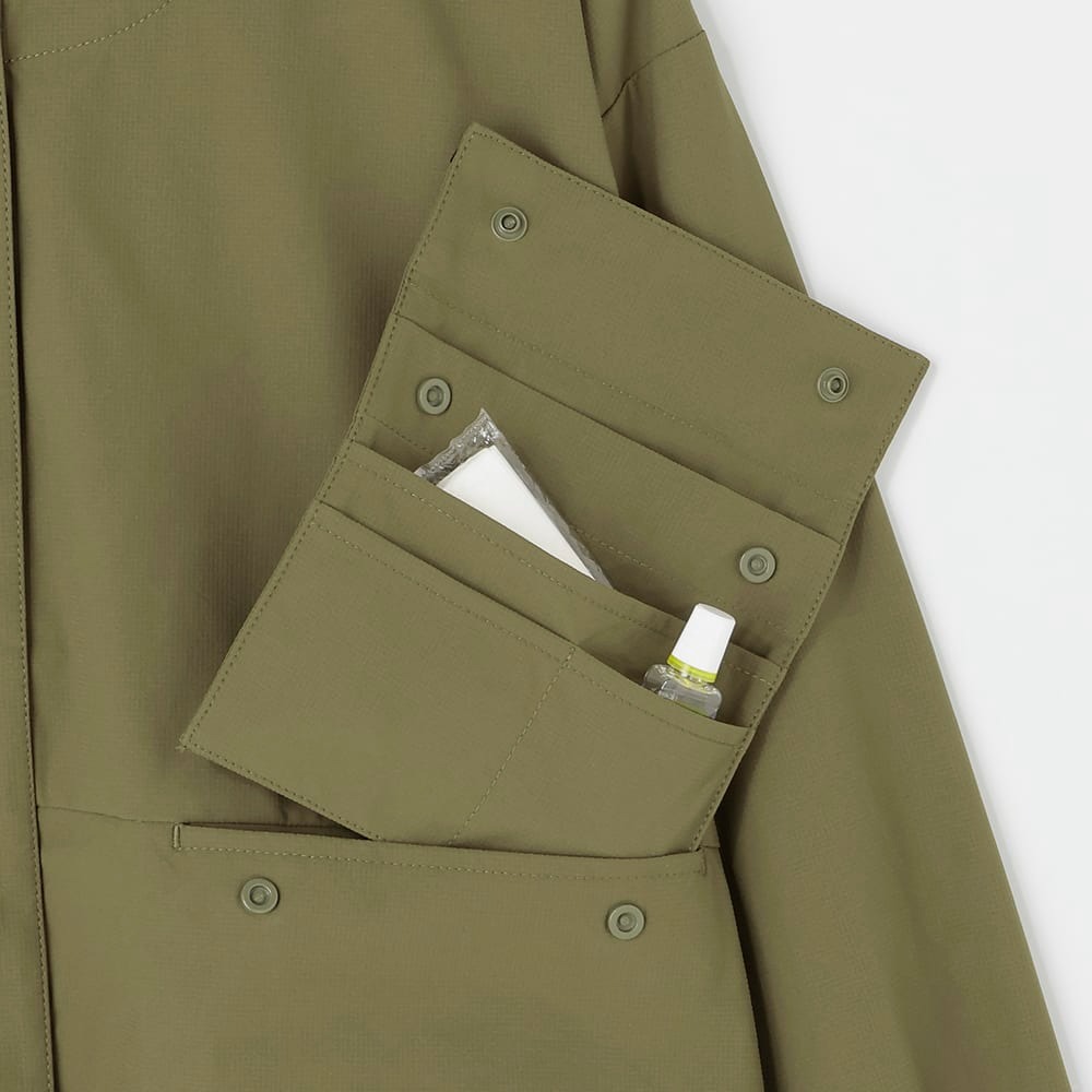 紫外線対策としても使いやすく、UPF50+のUVカット機能を備えており、日差しの強い日でも着用しやすい仕様です。さらに撥水加工が施されているため、小雨程度であれば水を弾き、天候が変わりやすい季節にも対応します。