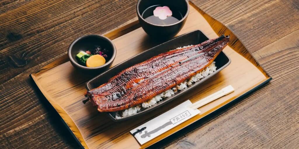 「夕凪うなぎ」は、広島市の中心地である新天地で営業するうなぎ料理店。古くから縁起が良いとされているうなぎを切らずに一本まるごと使用した「一本うな重」を名物です。一本うな重のうなぎは脂ノリが良いとされるニホンウナギを使用。30センチほどの肉厚な特大うなぎを一本まるごと提供しています。