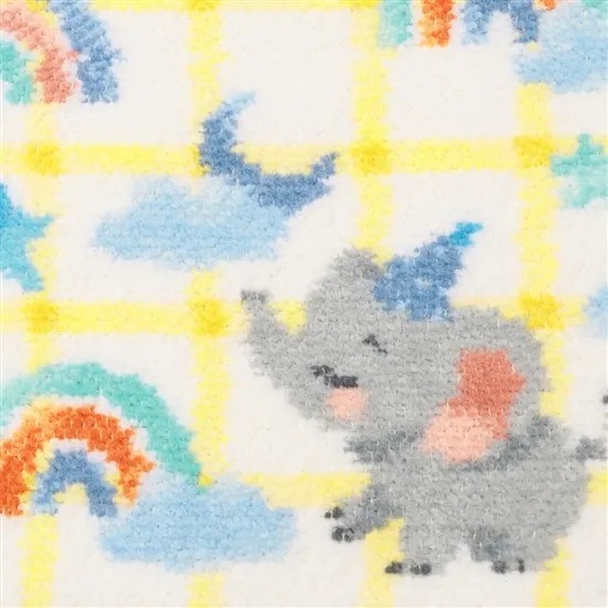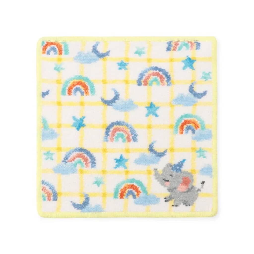 そんなフェイラーから発売されている「トゥインクルトゥインクル ハンカチ」は、ホワイト×ペールイエローを基調に、星や虹、ゾウなどのモチーフをあしらった、おとぎ話のような世界観でかわいらしいデザインが特徴。