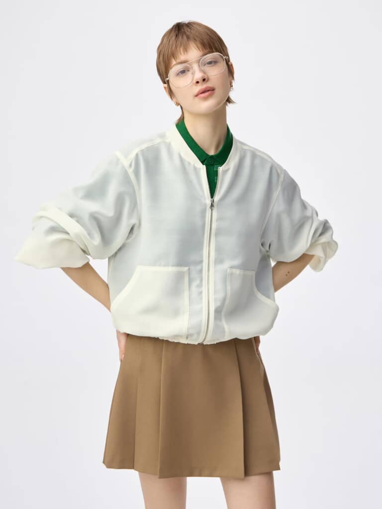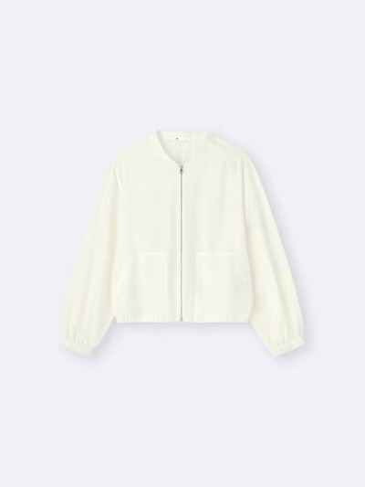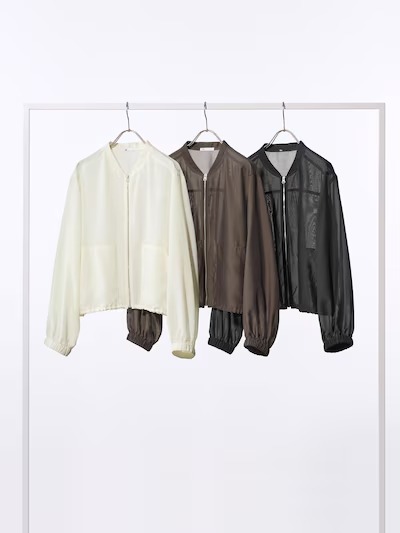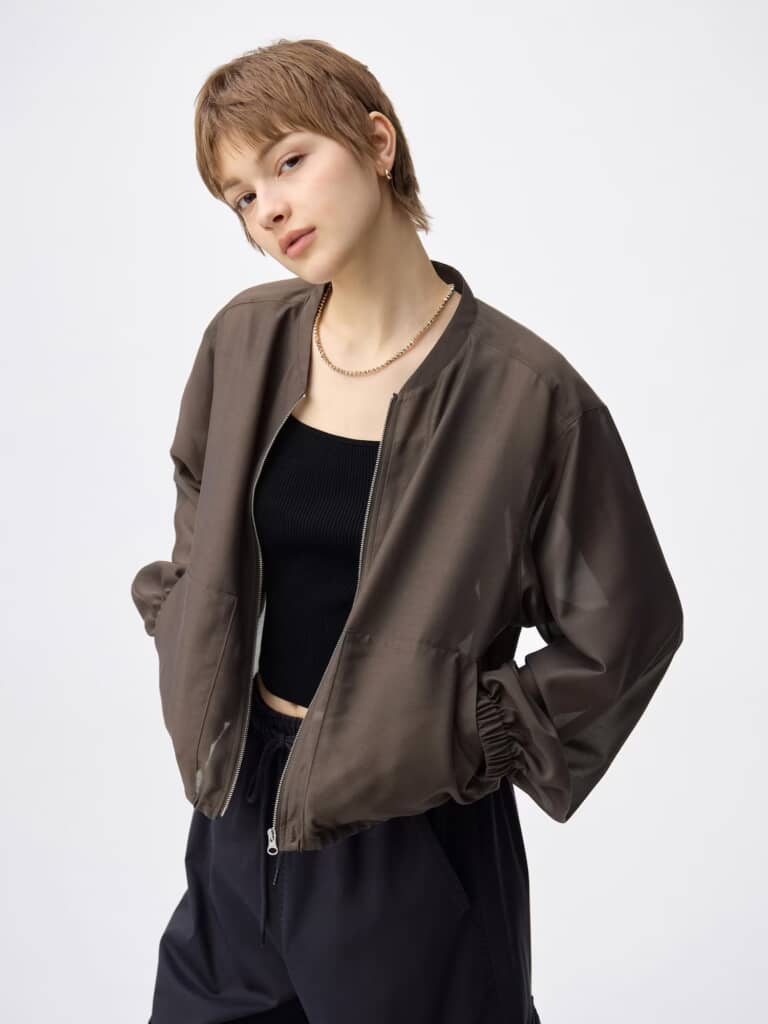 GUの「シアーブルゾン」は、ほどよい透け感が魅力の軽やかなシアー素材を使用したブルゾン。後ろ身頃や袖に施されたギャザーがデザインのポイントとなり、動きのあるやわらかな印象を演出します。裾にはドローコードを備えており、絞ることでシルエットの調節が可能。気分やコーディネートに合わせてアレンジが楽しめます。さらに、小さめの襟デザインでカジュアルにもきれいめにも着まわしやすく、幅広いスタイルにマッチする一着。カラーは38 DARK BROWN・01 OFF WHITE・09 BLACKの3種類、価格は2990円で販売されています。