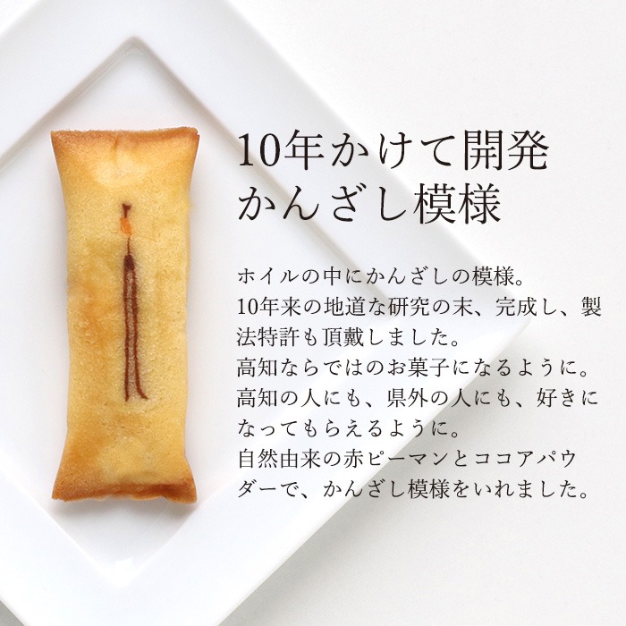 そんな浜幸の看板商品が「かんざし」。マドレーヌ生地でゆず入りの白あんを包み、ホイル焼きにした和洋折衷のお菓子です。10年かけて開発したというかんざし模様も特徴的。ホイル焼きにすることでやわらかな生地のうまみが閉じ込められ、ホクホクでソフトな食感と味わいを楽しめます。