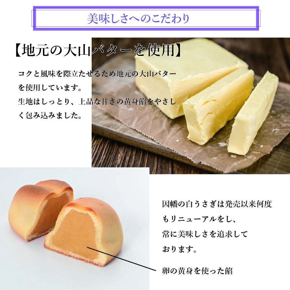地元の大山バターを使用し、しっとりとした甘さを控えめの生地で上品な黄身餡を包み込んだ同商品。かわいらしい白うさぎの「赤目」は、工場見学に来ていた小学生の「目があった方が可愛い」の一言で入れるようになったのだとか。絶妙なバランスの香ばしい焼き上がりで、世代を問わず愛される一品となっています。