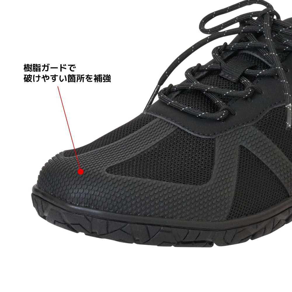 ワークマンの「ベアマリンシューズ」は、水辺でも陸地でも活躍する水陸両用のベアフットシューズ。中敷きを取り外すことで地面をダイレクトに感じられ、装着すれば適度なクッション性が加わる2WAY仕様が特徴です。破れやすい箇所は樹脂ガードで補強されており、アクティブな動きにも対応しやすくなっているのがうれしいポイント。さらに速乾性に優れているため、濡れた後も快適な履き心地を保ちます。カラーはミストグレー・ブラックの2種類、価格は2300円で販売されています。