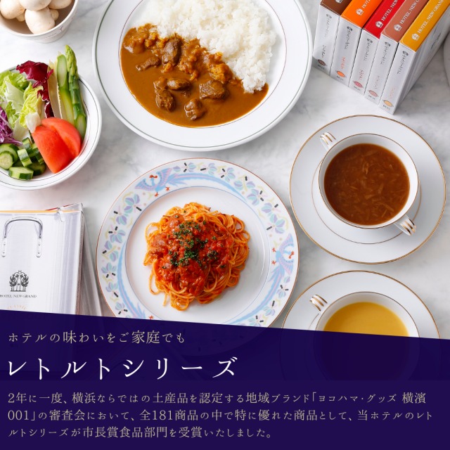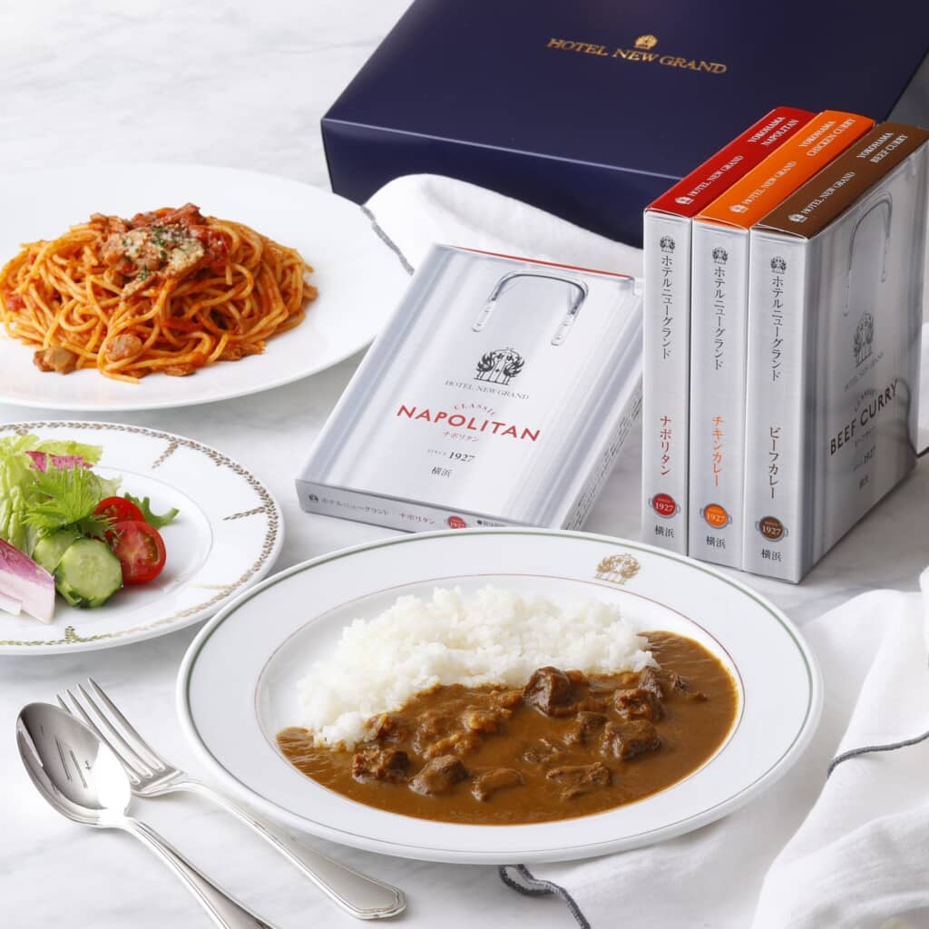 そんなホテルニューグランドの味を手軽に味わえるのが、同ホテルが販売している「レトルトグルメセット」。横浜の地域ブランド「ヨコハマ・グッズ 横濱001」の審査会において、全181商品の中から横浜市長賞食品部門を受賞したレトルトシリーズの特別セットです。大人気のナポリタンソースに加え、ビーフカレーとチキンカレーを詰め合わせ。本格的な味わいを自宅で手軽に楽しめます。寸胴鍋をモチーフにしたパッケージデザインも国内外で高く評価され、世界的なコンペティションで金賞を受賞しているのだとか。価格は税込み3240円で販売されています。