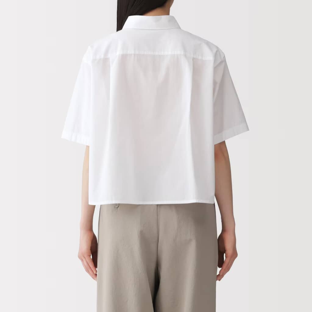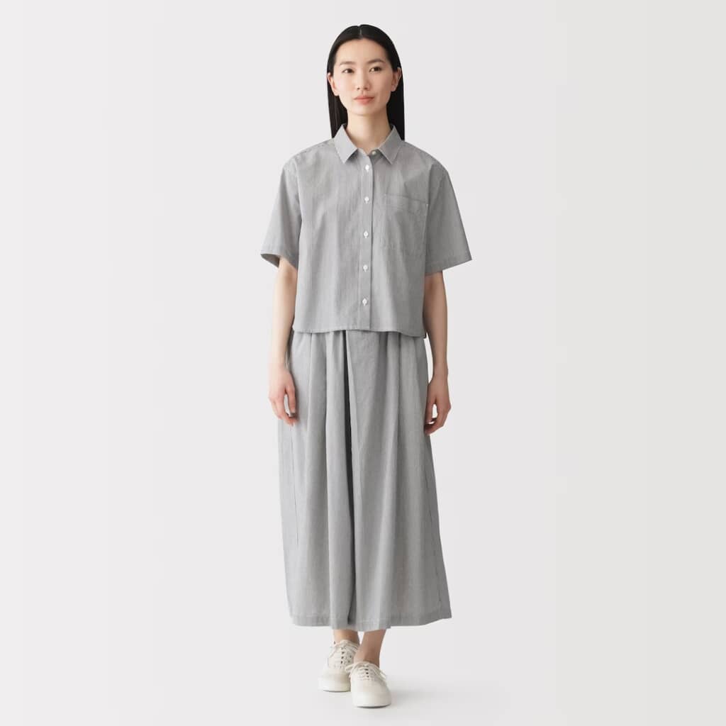 無印良品の「婦人 涼感 半袖シャツ」は、さらりとした肌あたりが特徴の涼感素材を使用した半袖シャツ。綿にはオーガニックコットンを採用しています。強撚糸の撚りを変えて凹凸を出したシアサッカー素材で、肌離れが良く、涼しく快適に過ごせるのが魅力。一枚での着用はもちろん、羽織りとしても活躍するレギュラーカラーの半袖シャツです。短めの着丈のボックスシルエットで、ワイドボトムやスカートとも合わせやすいデザイン。同素材のスカートパンツとセットアップするのもおすすめです。カラーは4種類、価格は税込み3990円で販売されています。