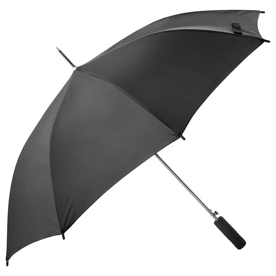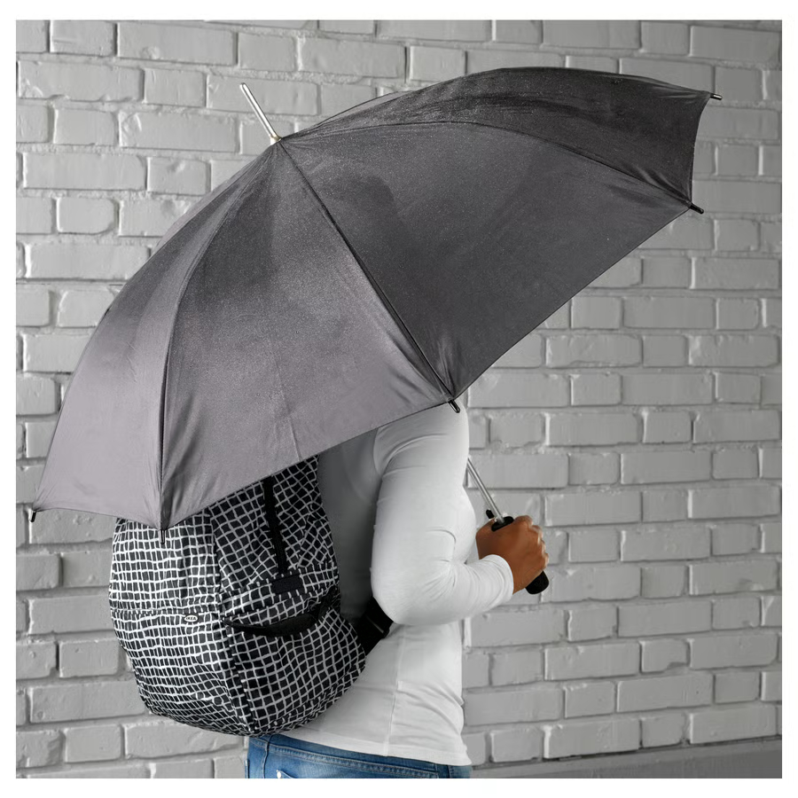 IKEA「KNALLA(クナラ)傘」は、シンプルで使い勝手のよい設計と手頃な価格が魅力の定番アイテムです。サイズは長さ約80cm、直径約105cmと、1人で使うには余裕のある大きさ。体や荷物をしっかりカバーできる実用的なサイズ感です。素材はポリエステル(布地)とスチールフレームを使用し、軽さと強度をバランスよく両立。持ち手にはEVA樹脂が使われており、やわらかく握りやすいのも特徴です。
