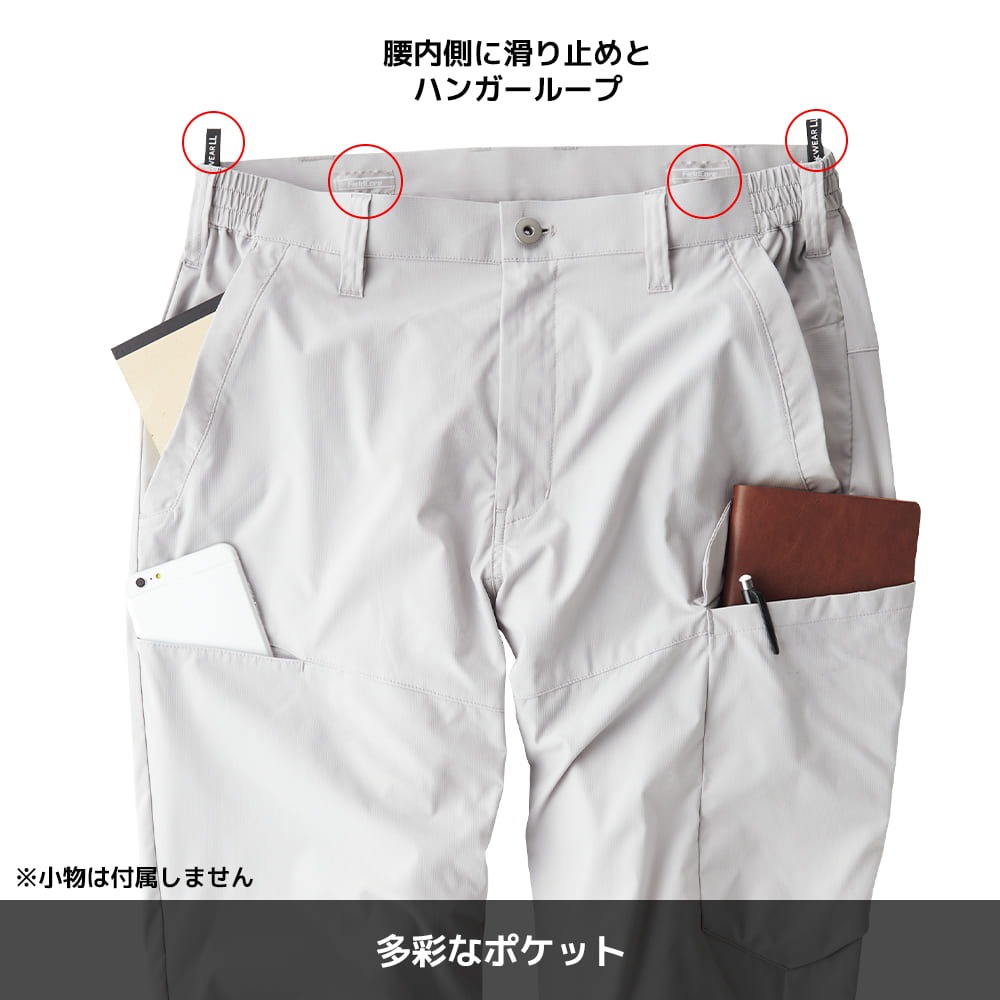多彩なポケットを備え、小物の収納に便利な実用的な仕様。腰内側には滑り止めとハンガーループを備え、使い勝手にも配慮されています。さらに耐久撥水加工(DROPTECH®)により水を弾きやすく、速乾性もあるため乾きやすいのもポイント。春から夏にかけて取り入れやすく、幅広いシーンで活躍する一本です。