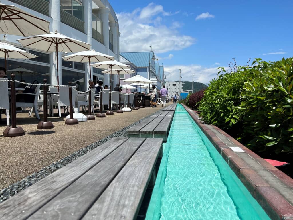 館内には土産店や海鮮系を含む飲食店が並び、伊豆らしい味覚を気軽に楽しめます。加えて、海が見える日帰り温泉や無料の足湯、遊覧船などもあり、食事や買い物に加えて過ごし方の幅があるのも魅力です。マリーナや海を望める立地で、伊東観光の途中に立ち寄りやすいだけでなく、周辺観光の拠点としても利用しやすい施設です。