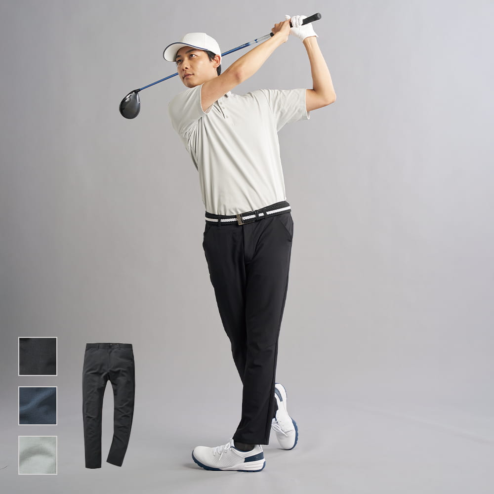 さらにポケット内にティー差し4本分、D環付きといった細やかな工夫も備えています。カラーはブラック・グレー・ネイビーの3色、サイズはM〜3Lまで展開。オールシーズン活躍できる機能性とシンプルなデザインで、練習からコースまで幅広く対応するパンツです。