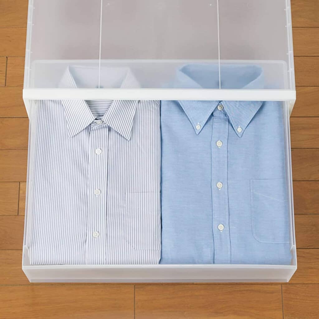 無印良品の「ポリプロピレン 収納ケース ワイド 中」は、横幅のある設計で、シャツやセーターなどを並べて収納できる引き出し式ケースです。半透明のポリプロピレン素材を採用しており、中身をひと目で確認できるため、衣類や日用品の整理がしやすいのもポイント。軽量で扱いやすく耐久性に優れているほか、複数段の積み重ねにも対応しています。別売りのキャスターを取り付ければ移動もスムーズ。クローゼットや押し入れのスペースを有効活用できる、シンプルで汎用性の高い収納アイテムです。