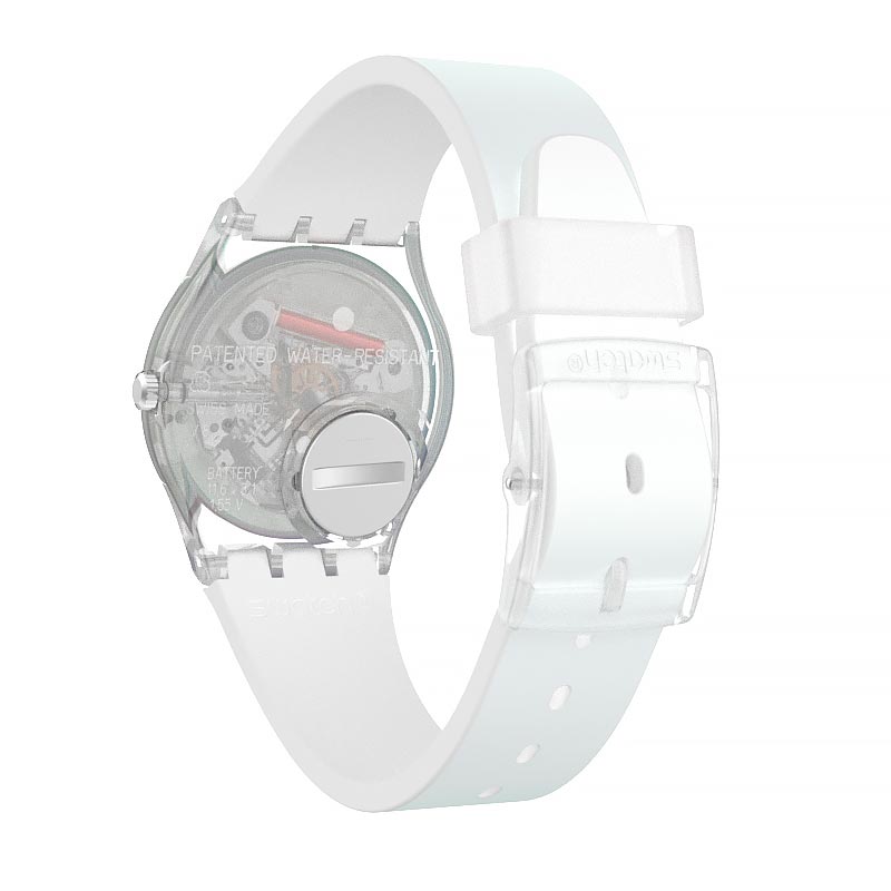 ベルトカラーは、爽やかなライトブルーのグラデーション。文字盤には、半透明のミラーコーティングを施した「スウォッチ ソーラー スペクトラムガラス」を使用。見る角度によって色が変わるのが特徴です。シースルーバックになっていて、内部の精密な動きが見えるのもうれしいポイント。つけているだけで気分が上がりそうです。