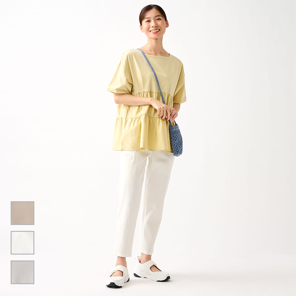 「レディースジョブライトアンクルパンツ」は、軽やかなはき心地と美しいシルエットを両立した、オンオフ問わず使いやすい一本。特徴は、くるぶし丈のアンクルデザイン。足元をすっきり見せてくれる軽快なシルエットで、パンプスやスニーカーとも相性がよく、季節感のあるコーディネートが楽しめます。ウエストはゴム仕様で、ストレスの少ないはき心地。さらにポケット付きで実用性も高く、防汚加工やUVカットといった機能も付いています。