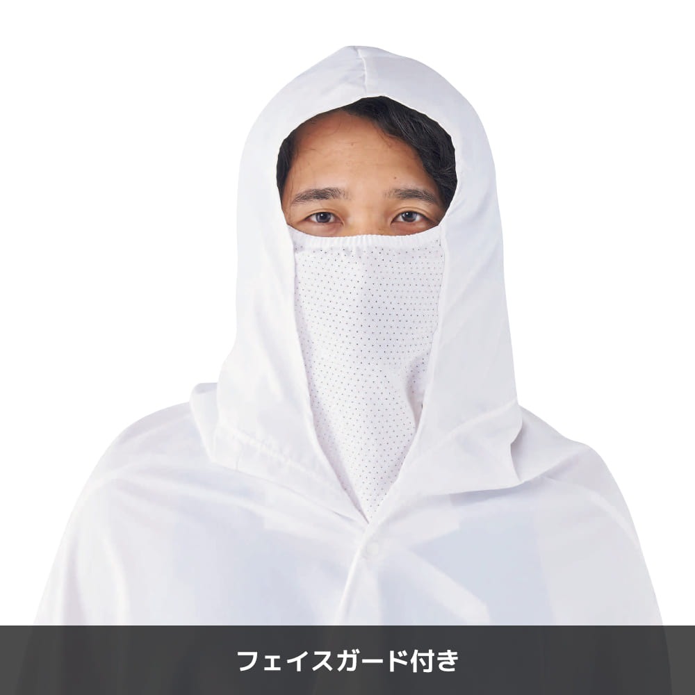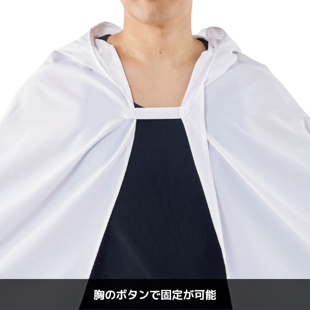 ポンチョ型ならではのゆとりのあるシルエットで風通しがよく、胸元や腕部分のスナップボタンによって着方を調整できるのも特徴。取り外し可能なフェイスガードや収納袋も付属し、アウトドアやイベントシーン、日常の移動時などさまざまな場面で活躍します。