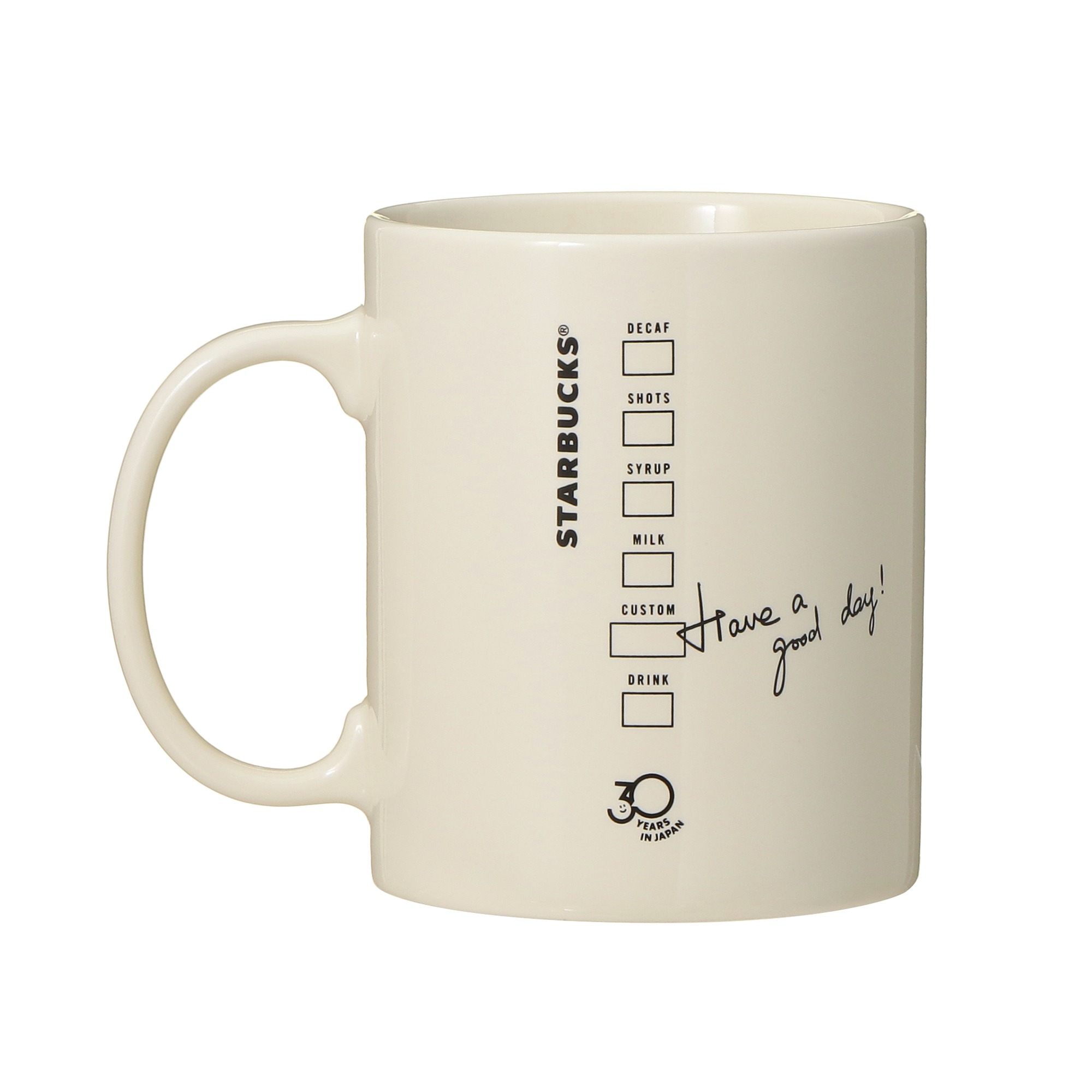 スターバックスの「マグ30YEARS355ml」は、スターバックスが日本に誕生した当時のロゴデザインをあしらった、30周年記念アイテムならではの特別感が魅力のマグカップです。正面には特別なロゴ、背面にはIDボックスと手書き風メッセージ「Have a good day!」に加え、30周年マークをデザイン。スターバックスらしいナチュラルなアイボリーカラーで、シンプルながら印象的な仕上がりとなっています。電子レンジや食洗機で使用できるのもうれしいポイントですね。