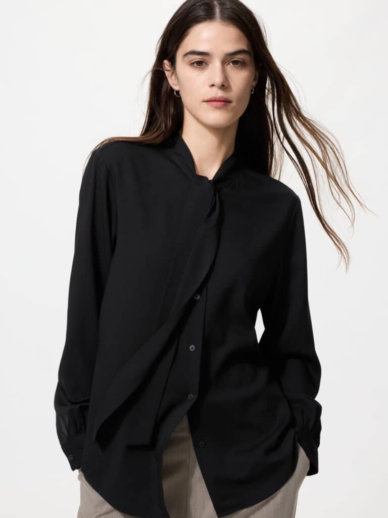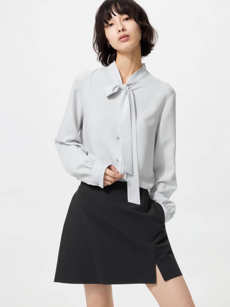 ユニクロの「レーヨンボウタイブラウス」(2990円)は、肌触りのなめらかなレーヨン混素材を使用した長袖ブラウスです。最大の特徴は、洗濯してもシワになりにくいイージーケア仕様。忙しい朝でもアイロンがけの手間をかけずに、清潔感のある着こなしが完成します。