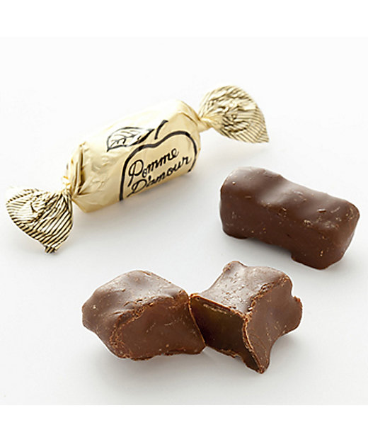 「ポームダムール」(一番舘)とは、フレッシュなりんごを長時間かけて蜜でやわらかく炊き上げ、その蜜煮りんごを、ほろ苦いビターチョコレートでコーティングしたお菓子。口に入れると、外側のチョコのほろ苦さと中のりんごの甘酸っぱさが広がり、単なるチョコ菓子とは一線を画すバランスの良さが魅力です。