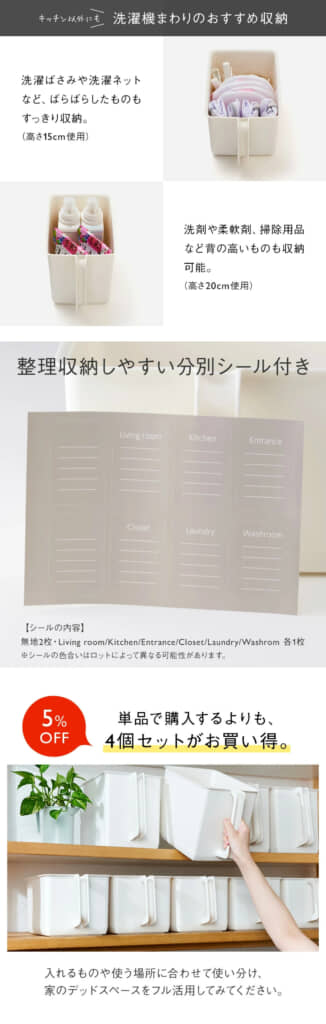 また、オフホワイトカラーで中身が見えにくく、生活感を抑えながら収納できるのも特徴。ラベルシールも付属しているため、中身を分類して整理しやすく、家族ごとや用途ごとに収納が可能です。