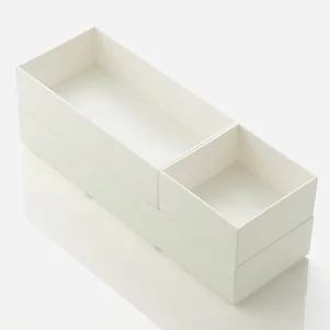 KEYUCAの「Re BOX」は、シンプルな箱型の収納ケース。幅や奥行きが規格化されており、異なるサイズ同士でも隙間なく配置できるため、引き出し内を効率よく区切ることができ、細々としたアイテムを無駄なく収められるのが大きな特徴です。素材にはABS樹脂を使用し、軽量で扱いやすい一方、フチに厚みを持たせることでしっかりとした強度も確保。長く使える耐久性と安定感を備えています。
