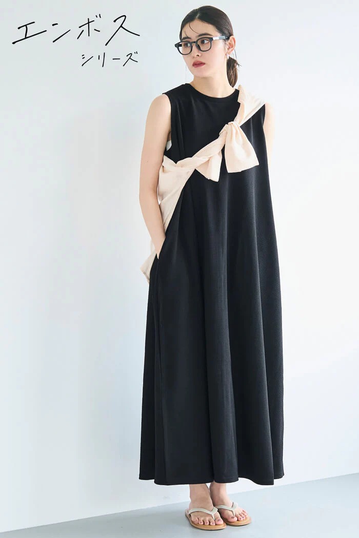 「エンボス加工マキシ丈ノースリーブワンピース」は、凹凸のある軽やかな生地がほどよい伸縮性を生み出し、長時間の着座や移動でもストレスフリーに過ごせるワンピース。シワが目立ちにくく、自宅で洗ってハンガー干しすれば翌朝には着られる手軽さも魅力。肌に張り付きにくいため汗ばむ季節でも快適で、深めのポケット付き仕様もうれしいポイントです。