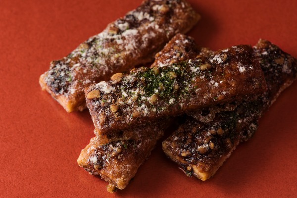 ひと口サイズのパイ菓子の上には、ソースやマヨネーズ、青のりを思わせるトッピングがのっていて、袋を開けた瞬間から思わず笑ってしまうような見た目。さらに、ソースやマヨネーズを感じさせる香りがふわっと広がり、最初はたこ焼きのような印象なのに、食べ進めるうちにだんだん甘さが広がっていく、不思議な味の変化が楽しめます。ソース、青のり、カツオ節といったたこ焼きらしい要素に、くるみやキャラメリゼ、サクサクのパイ生地を組み合わせているのが特徴です。