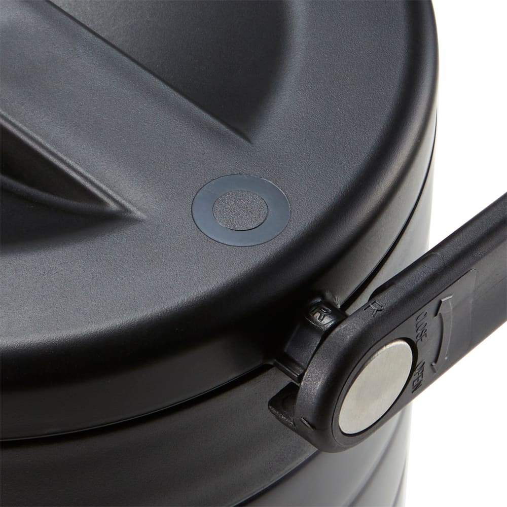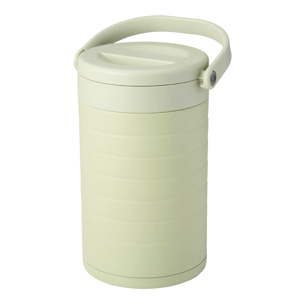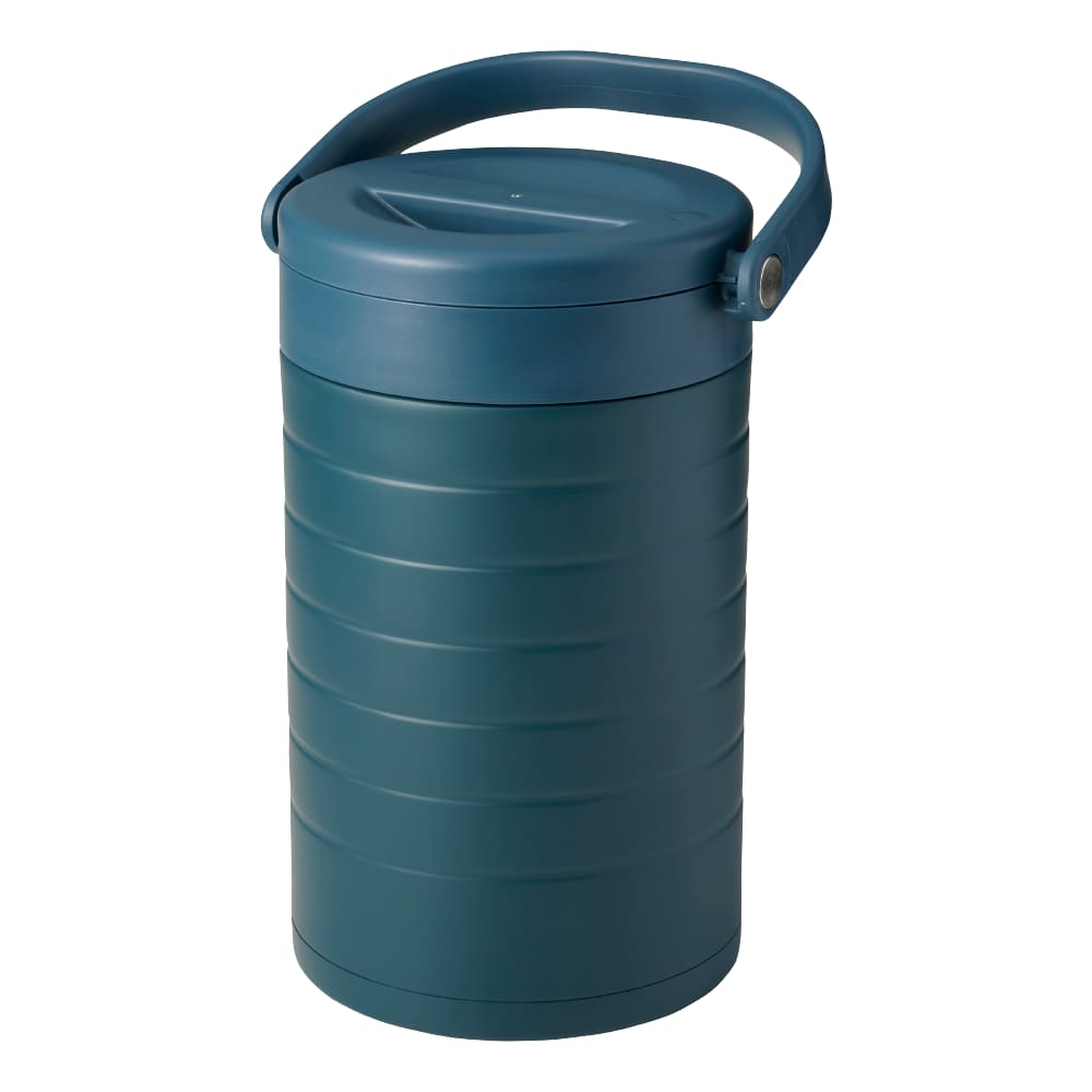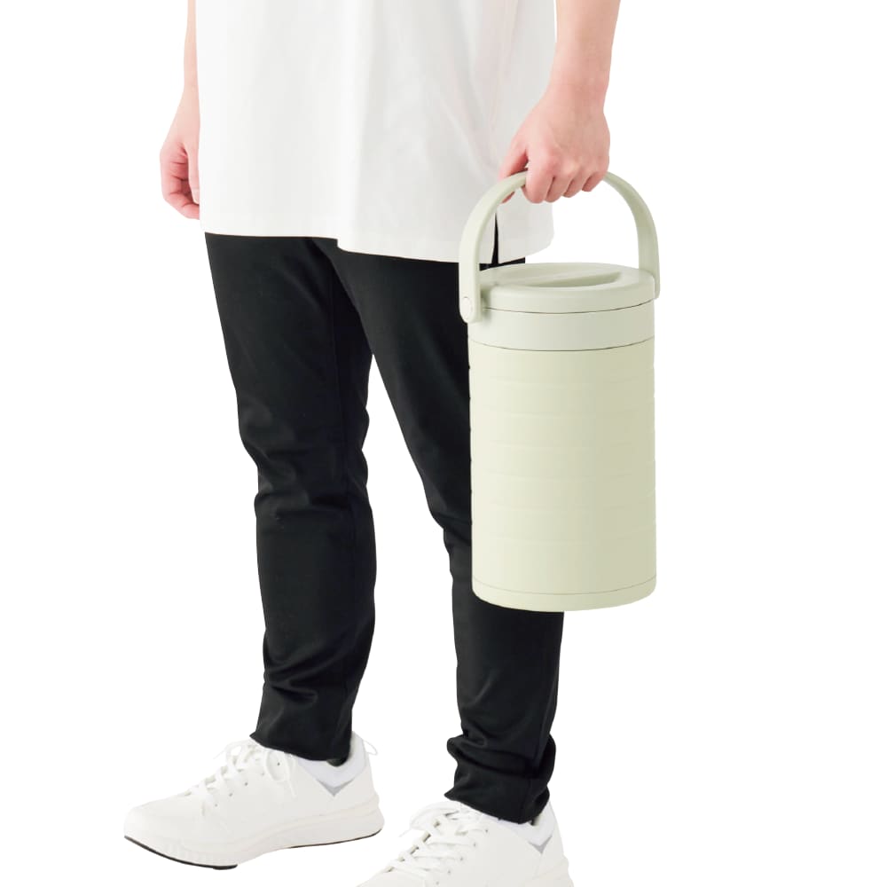 「ラウンド真空ハイブリッドコンテナ」は、真空二重構造による高い保冷・保温力を持つコンテナ。飲み物や食材の温度を長時間キープできる便利アイテムで、アウトドアやキャンプ場、スポーツ観戦などのシーンで重宝します。容量は約5Lで、500mlのペットボトルを最大4本収納可能。筒状のデザインで無駄なスペースが少なく、コンパクトながらしっかり収納できる設計になっています。持ち手付きで移動もラクラク。フタは持ち手で操作できるロック構造を採用しており、持ち手の方向をOPEN側へ倒すとフタが外れ、CLOSE側へ倒すとフタがロックされます。