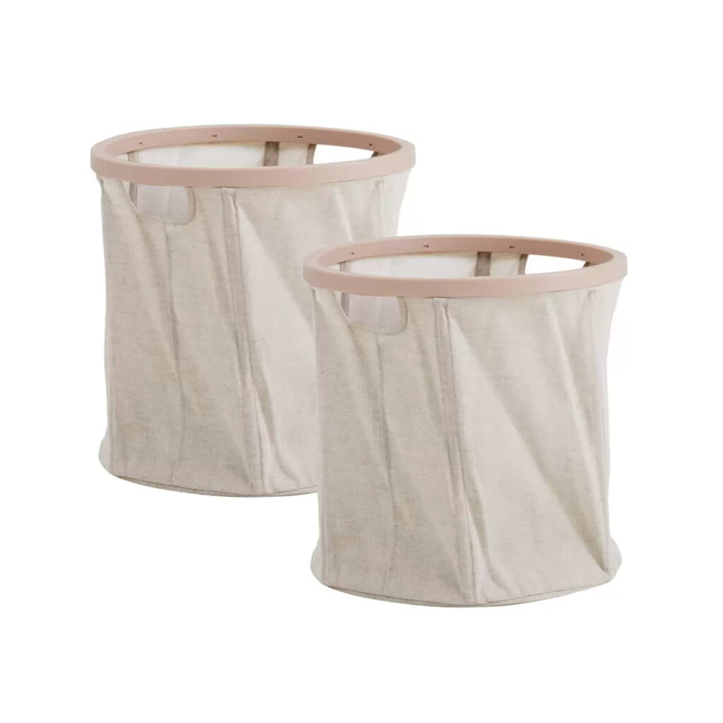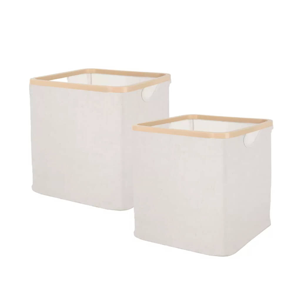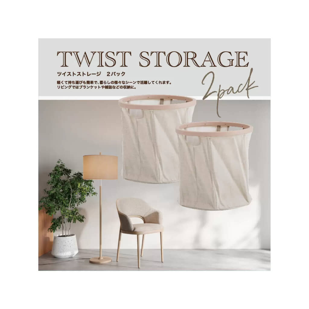 「ツイストストレージボックス2個セット」は、コストコで販売されている大容量タイプの収納ボックス。使わない時は折りたたんで隙間に収納できるのが特徴で、展開もワンタッチで簡単。衣類やタオルはもちろん、おもちゃや日用品、ランドリー収納など幅広い用途に対応します。素材には耐久性の高いポリエステル綿を使用し、フレーム部分は丈夫なダブルリム仕様。耐荷重は約6kgです。