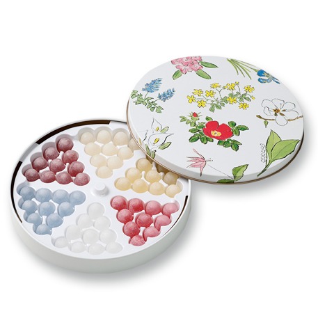 六花亭の「六花のつゆ」は、砂糖の薄い膜で洋酒を包み込んだ小粒のボンボン菓子です。表面は砂糖のシャリッとした軽やかな口当たりで、かむと中からワインやブランデー、うめ酒、ペパーミント、コアントロー、ハスカップといった6種類の風味が広がります。カラフルな粒が整然と並ぶ姿は見た目にも印象的で、開けた瞬間の華やかさも魅力です。